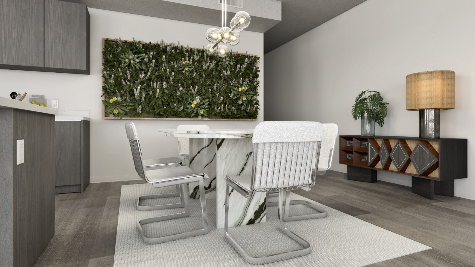 Turnkey in less than a month. Designed for an influencer who wanted James Bond in Miami. Lenny Kravitz for CB throughout, a living green wall, black marble, globe pendants, floor-to-ceiling glass over Brickell. Minimal, cinematic, unmistakably Miami.
