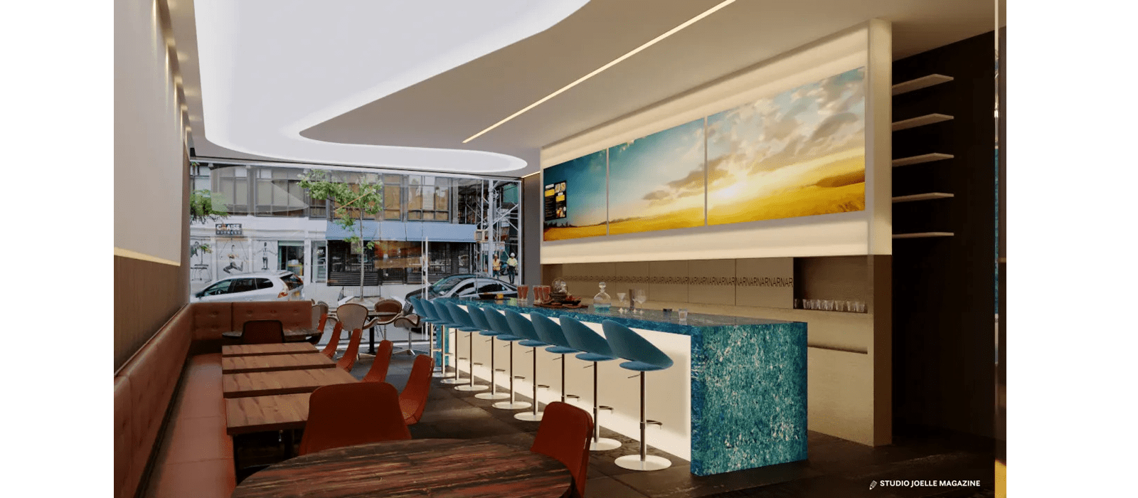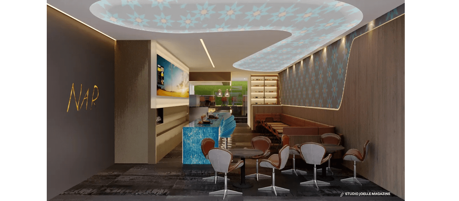 Naar means fire in Arabic. A full renovation taken further space, menu, and uniform conceived as one identity. At ground level, a turquoise Cambria quartz bar anchors the room, flanked by cognac leather chairs and walnut banquettes. Interactive screens bring energy without noise. Glass stairs lead to a private skylit dining room above – intimate, quiet, entirely its own