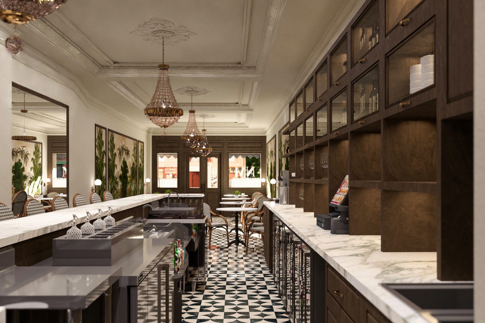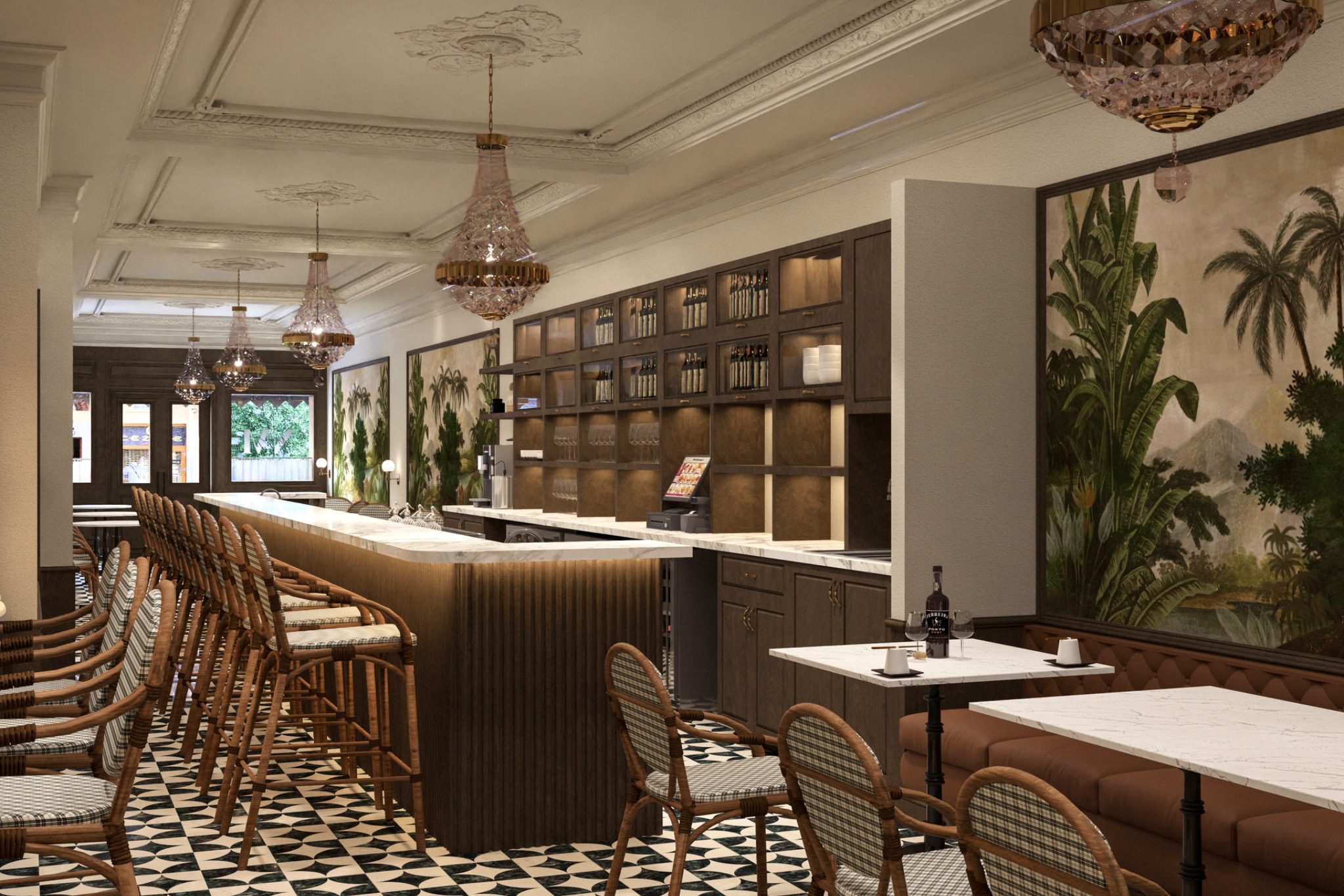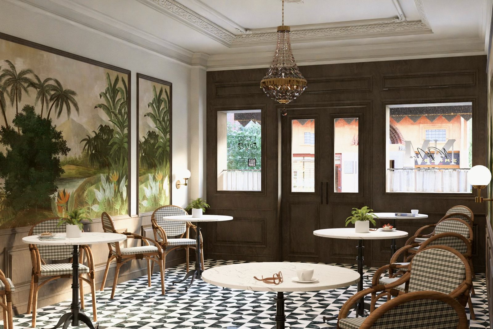 A Lower East Side café with a Parisian soul. Hand-painted tropical botanical murals, rattan bistro chairs, and a black-and-white diamond floor — designed for a neighborhood that wants somewhere that feels like it’s always been there.