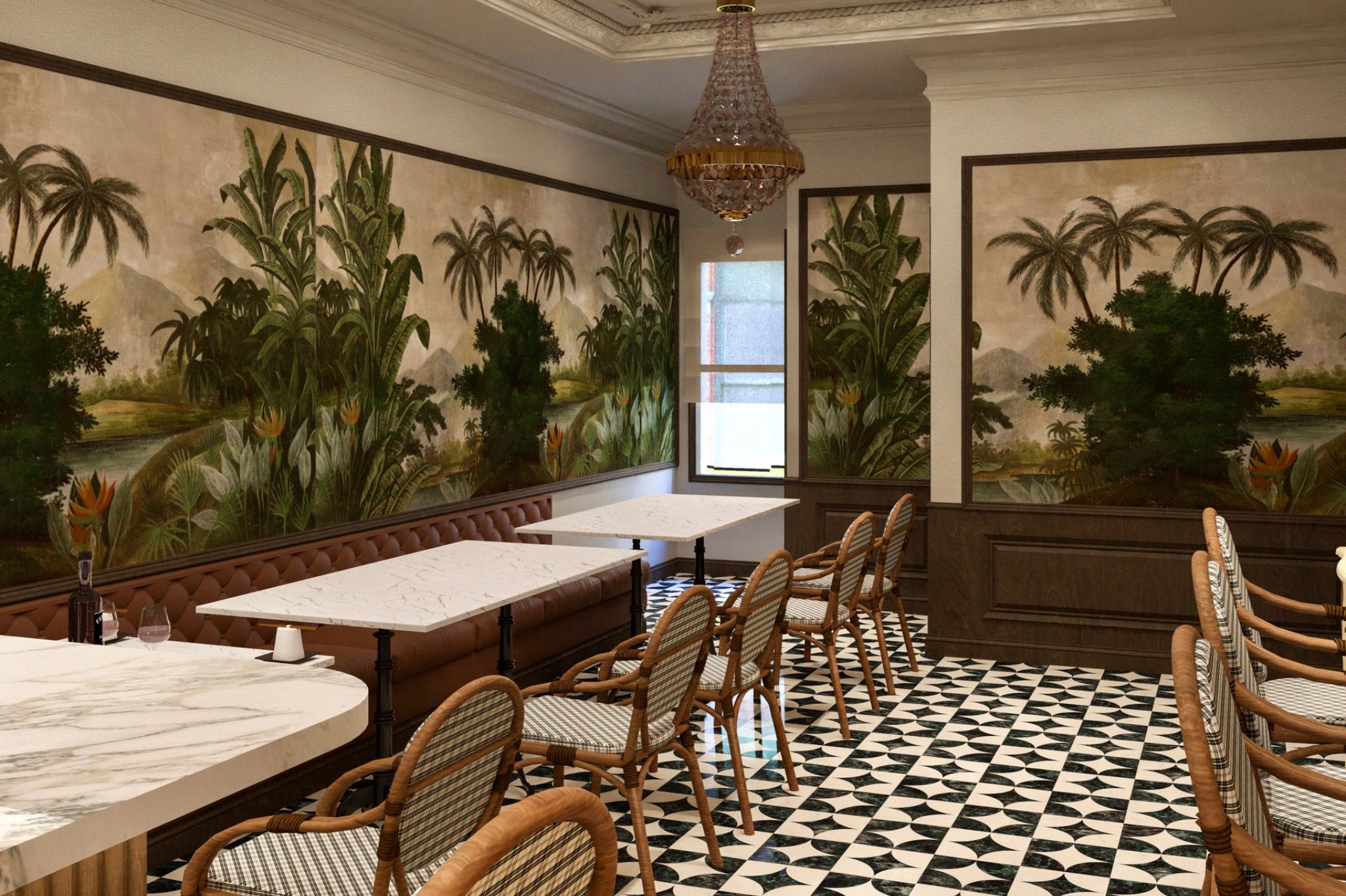 Hand-painted botanical murals, Vintage Parisian furnishings, Crystal chandeliers, Marble-topped tables, Rattan bistro chairs, Sophisticated color palette, Intimate dining spaces, Botanical-inspired design