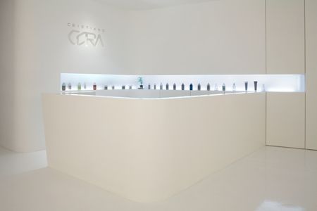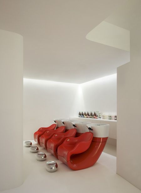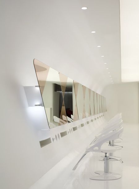 Thirteen stations. All white. Angular walls that fold into each other, a French latex stretch ceiling, sculptural chairs throughout. Designed for former Vidal Sassoon creative director Cristiano Cora — a salon that operates as much as an architectural statement as a place of work. Published in Dezeen and Architizer.